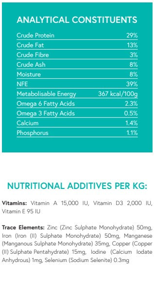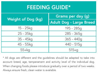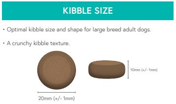 We’ve made the kibble size larger to both help slow down the speed of eating and promote a positive elongated eating experience. Large breed dogs also have a large muscle mass which needs to be supported by high quality sources of protein, we have increased the protein content by 2% compared to the Adult Dog recipe and provided a moderate level of fat to help avoid unnecessary weight gain.