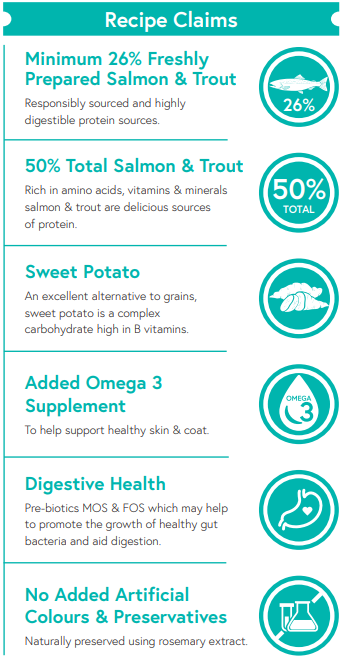 Salmon is naturally rich in omega 3 essential fatty acids which have anti-inflammatory properties and provide support for skin and coat condition and joint health.