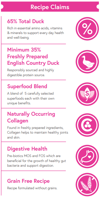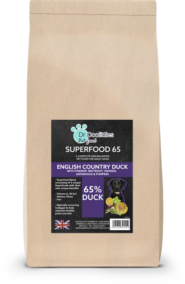 Here at Dr Doolittles, we realise that duck is a high-quality protein source that provides great benefits for dogs. Your Superfood 65® English Country Duck recipe contains a total meat content of 65%, in which 35% is freshly prepared, as well as a blend of five superfoods, each with their own unique benefits.