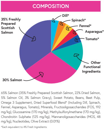 Here at Dr Doolittles, we recognise that Scottish Salmon is a premium quality protein source that provides fantastic benefits for dogs. Our Superfood 65® range contains two recipes (Adult and Puppy) that include Scottish Salmon as their main protein source. Each of our Superfood 65® Scottish Salmon recipes contains 65% total Salmon with a minimum of 35% Freshly Prepared Scottish Salmon plus Dill, Spinach, Fennel, Asparagus and Tomato, each with their own unique benefits.