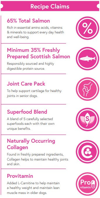 Here at Dr Doolittles, we recognise that Scottish Salmon is a premium quality protein source that provides fantastic benefits for dogs. Our Superfood 65® range contains two recipes (Adult and Puppy) that include Scottish Salmon as their main protein source. Each of our Superfood 65® Scottish Salmon recipes contains 65% total Salmon with a minimum of 35% Freshly Prepared Scottish Salmon plus Dill, Spinach, Fennel, Asparagus and Tomato, each with their own unique benefits.