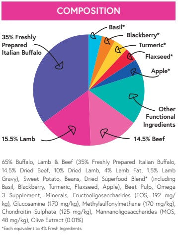 Minimum 35% Freshly Prepared Italian Buffalo: Responsibly sourced and highly digestible protein source.